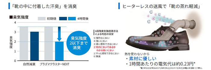 イオン濃度50,000個/cm3以上の「プラズマクラスターNEXT」搭載により、靴の中に付着したニオイを消臭※5することが可能です。また、靴の素材に優しいヒーターレスの送風で、靴の中の蒸れも軽減※6します。