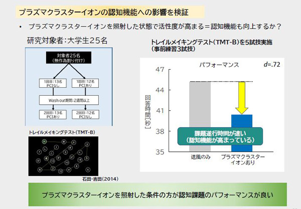 さらに、認知機能の影響を検証する認知機能テストを実施。プラズマクラスターイオンを照射した条件のほうが認知課題のパフォーマンスが良いことを確認しました。