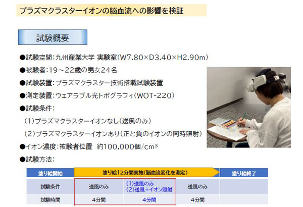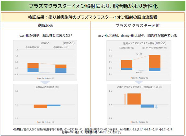 検証では、脳血流の変化を測定する装置を用い、塗り絵中のヒトに対して、プラズマクラスターイオンを照射しない場合(送風のみ)とプラズマクラスターイオンを照射した場合で脳血流の変化量を比較しました。