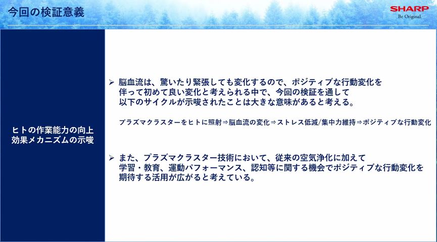 当社は引き続き、プラズマクラスター技術の、人の周りにある「空気」だけでなく、そこにいる「人」への効果についても実証を進めてまいります。