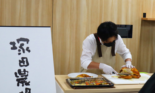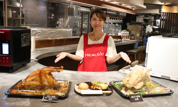 また、塚田農場を運営する株式会社エー・ピーホールディングス 執行役員の吉本様にゲスト登壇いただき、今回共同開発したダウンロードメニュー「『黒さつま鶏』ローストチキン丸鶏」の詳細についてご説明いただきました。生産から販売までを一貫して手がける独自の「生販直結」の事業モデルをご紹介いただいた後、「ヘルシオ」で該社の丸鶏をお店で焼き上げたように調理できることをご説明いただきました。