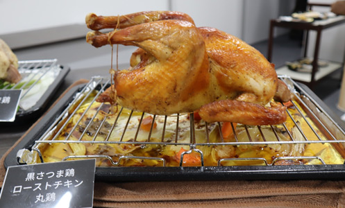 『黒さつま鶏』ローストチキン丸鶏(左)と調理前の丸鶏(右)