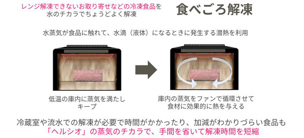 「食べごろ解凍」は、電子レンジでの解凍に適さない冷凍のローストビーフやスイーツなどの食材を、食べごろの状態に解凍することができる機能です。低温の庫内に水蒸気を充満させた後、ファンで水蒸気を循環させることで効果的に食品に熱を与えます。食材に合わせて庫内の温度を適切にコントロールし、すばやく解凍することができます。