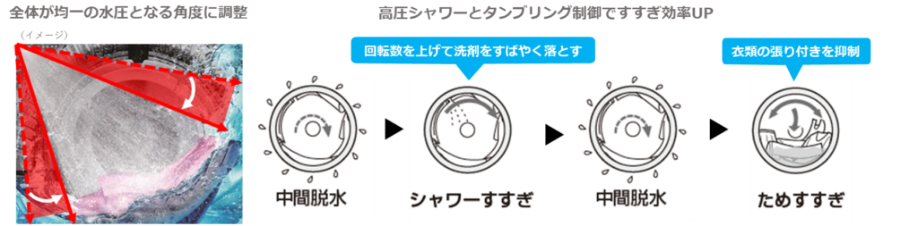 ■「高圧シャワーすすぎ」を新開発。節水しながら効率よくすすぎ、衣類の洗剤残りを抑制