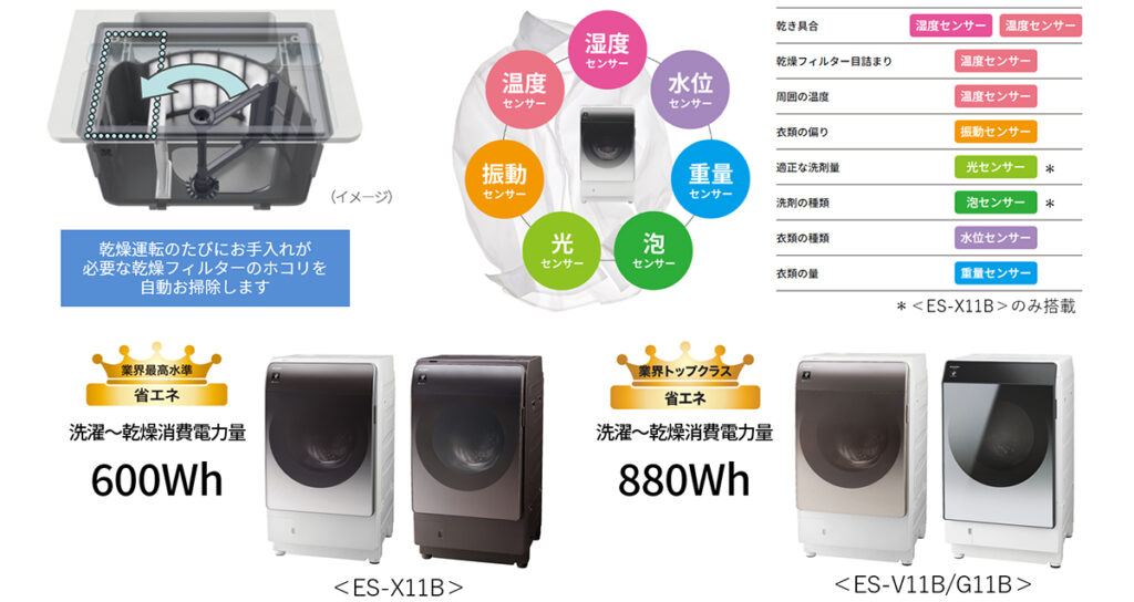 乾燥運転のたびに乾燥フィルターに溜まったホコリを自動でお掃除する※3ことで、お手入れの手間を省きつつ、風通しを良くして乾燥効率の低下を防ぐ「乾燥フィルター自動お掃除」機能を搭載。また、「温度」や「湿度」をはじめとするさまざまなセンサーで洗濯の状況を検知して最適な運転制御を行うことで、消費電力を抑え、業界トップクラスの省エネ性能を実現しました。