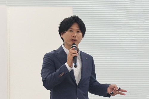 続いて、同 国内商品企画部 主任の吉岡さんより新製品の特長を紹介。3機種すべてにおいて業界トップクラス※1の省エネを実現したことに加え、最上位の<ES-X11B>では、 高い乾燥力の「ハイブリッド乾燥NEXT」対応のほか、業界最高水準※2の「省エネ」「節水」「低騒音」を実現していることを説明しました。また、新構造を採用した「乾燥ダクト自動お掃除」や、新搭載の「ドアパッキン自動洗浄」などの「ラク家事」機能に加え、高い節水力を実現する新開発の「高圧シャワーすすぎ」などを紹介しました。