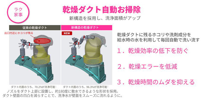 ■「乾燥ダクト自動お掃除」機能の進化や新搭載の「ドアパッキン自動洗浄」機能により、乾燥効率の低下を抑え、日々のお手入れの手間を軽減