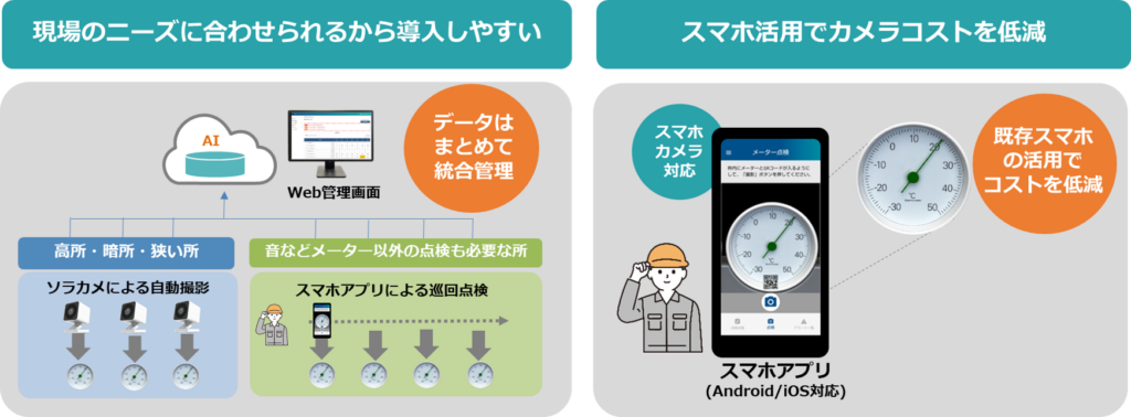 高所や暗所など点検が危険な箇所は固定カメラ利用プラン、メーターが多いエリアはスマホカメラ利用プランなど、現場の状況に応じて幅広いニーズに対応できます。また、スマホカメラ利用プランは専用カメラが不要なので、低コストでご利用いただけます。 さらに、ハイブリッド利用でも点検データはクラウドで統合管理が可能。いつでもオフィスなど離れた場所からでもWeb管理画面を遠隔確認できるため、管理者の業務を効率化できます。
