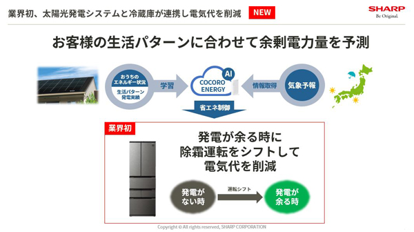 住宅用太陽光発電システムで発電した電気を蓄電池などにためて、効率よく活用する動きが拡大しています。本シリーズは、当社のクラウドHEMS※6サービス「COCORO ENERGY」により太陽光発電システムと連携させることで、余剰電力に応じた冷蔵庫の運転制御を実現しました。AIがユーザーの生活パターンや気象情報などから、余剰電力量があるタイミングを予測し、そのタイミングで消費電力量の多い除霜運転を行うことで、電気代の抑制を図ります。