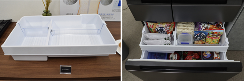 冷凍食品市場の拡大や、ホームフリージング活用の増加に対応し、冷凍室の収納性を向上。<SJ-MF55M/MF51M>では、サイズの異なる冷凍食品や使いかけの冷凍食品も効率よく“縦置き”ですっきりと収納できる「タテ置き名人」を新たに採用。<SJ-MF46M/MF43M/MW46M>には、可動式の仕切りで、ケースをフレキシブルに4つに仕切れる「4切り名人」を搭載しているので、食品のサイズ・形状に合わせて上手に整理することが可能です。冷凍室内が整理でき、使いたい食品も見つけやすくなるので、時短にも繋がります。