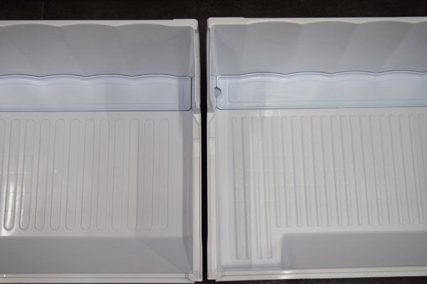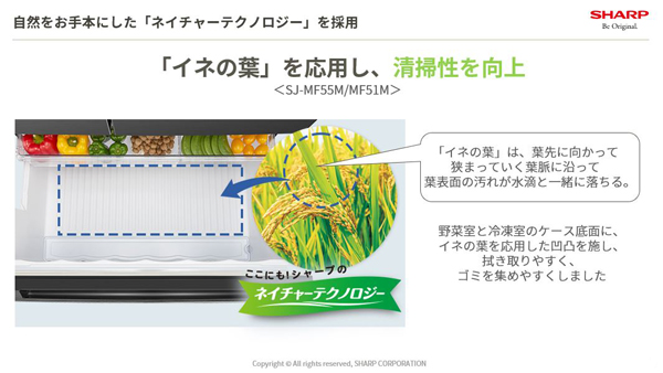 イネの葉の、葉先に向かって狭まる葉脈により葉表面の汚れが水滴と一緒に落ちる形状を応用し、野菜室と冷凍室のケース底面に凹凸を施したことで、拭き取りやすく、ゴミを集めやすくなります。<SJ-MF55M/MF51M>