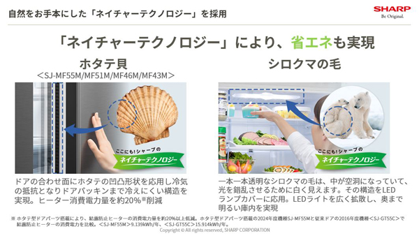 フレンチドアタイプの冷蔵室ドア開閉部には、ホタテ貝の凹凸を模した形状をドアパッキンの手前に採用。空気抵抗を大きくし、ヒーターの消費電力量を低減します。