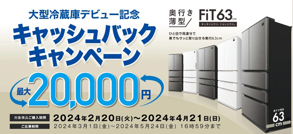 大型冷蔵庫デビュー記念にともない、4月21日(日)までの期間中、対象冷蔵庫のご購入で最大20,000円キャッシュバックキャンペーンを実施中です。