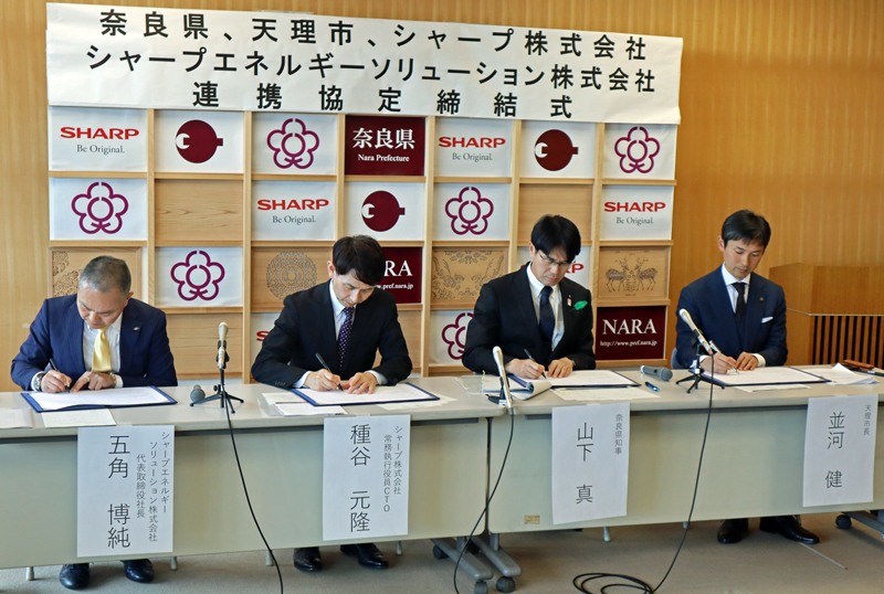 4月12日(金)、当社並びにシャープエネルギーソリューション株式会社(以下、SESJ)は、奈良県および天理市と、奈良県庁にて連携協定締結式を実施しました。奈良県内の産業振興と経済の持続的な発展により地域社会の活性化に寄与することを目的とするものです。
