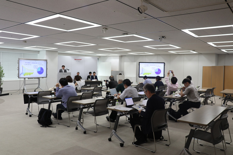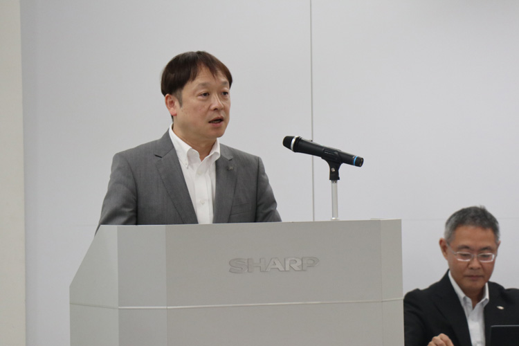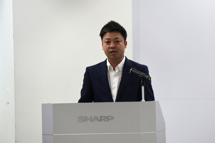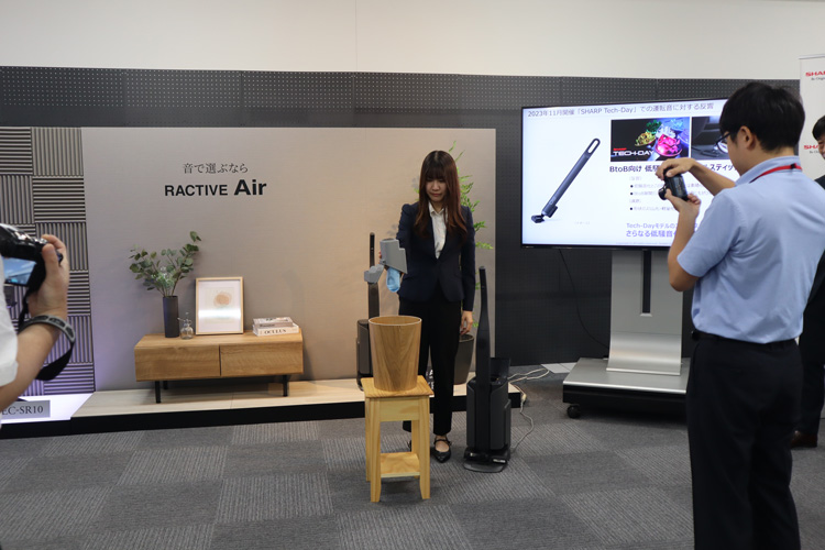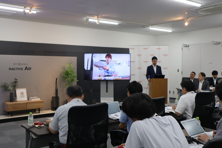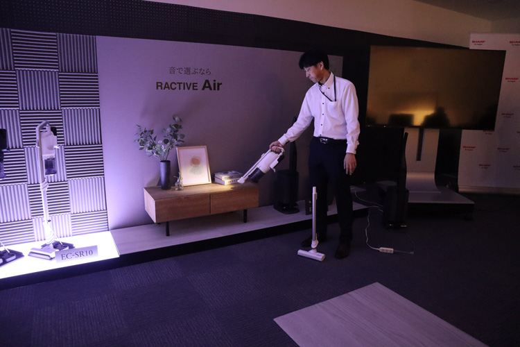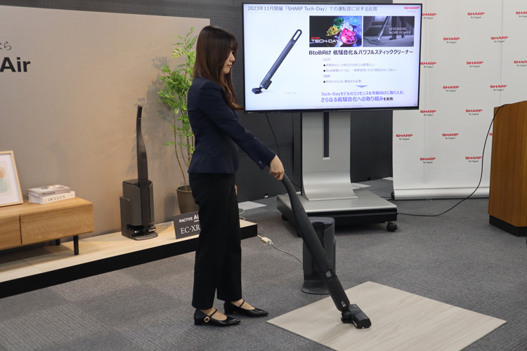 冒頭、SAS事業本部 清潔ランドリー事業部長の小森さんより、当社の「RACTIVE Air」が 2016 年の発売以来、本年 3 月にシリーズ累計販売台数 140 万台を達成したことと、共働き世帯の増加に伴い、「時間を気にせず掃除をしたい」というユーザーが増加し、運転音の静かさを追求した「RACTIVE Air」が市場で高く評価されていることを紹介しました。また、昨年のSHARP Tech-Day に出展した低騒音とパワフルな吸引力を両立させたモデルも好評だったことから、「音」に徹底的にこだわったシャープらしい商品として、新たにステーションタイプのコードレススティック掃除機を発売することを説明しました。