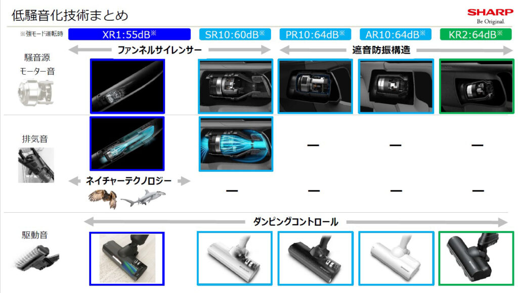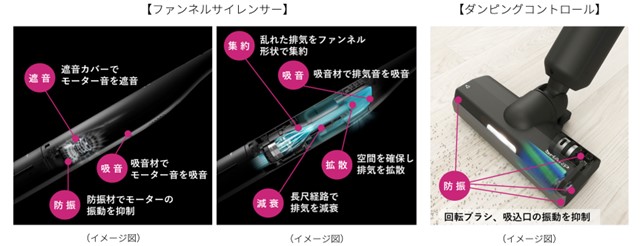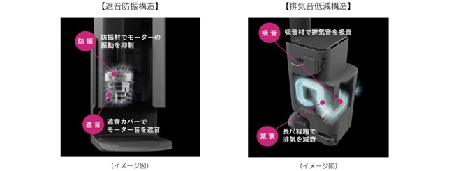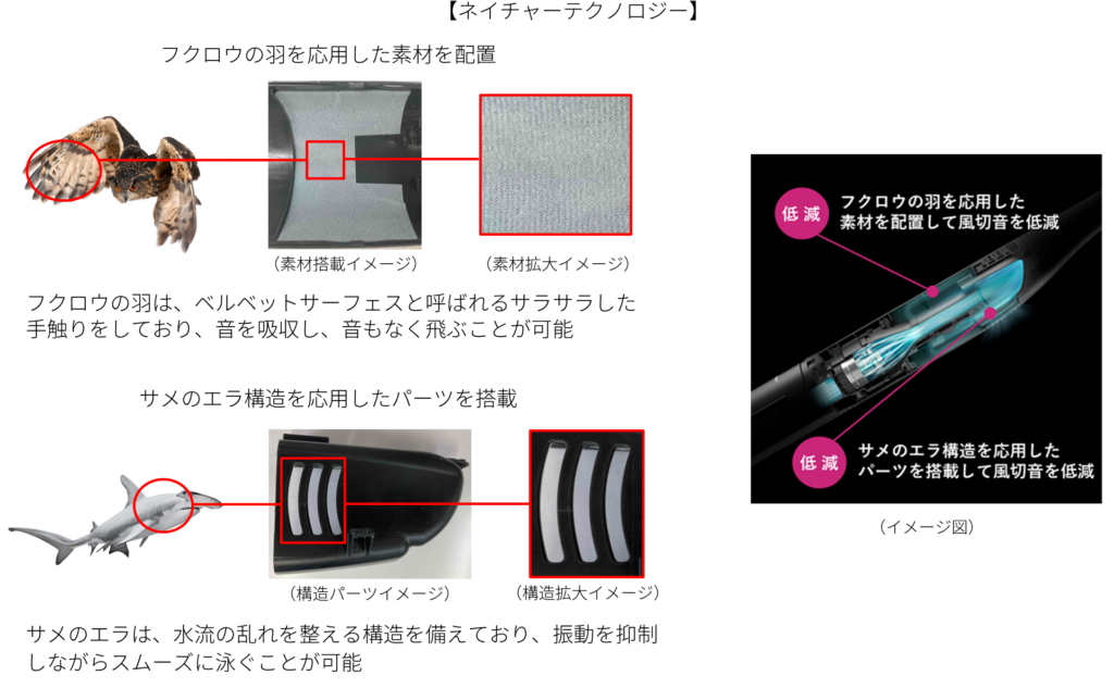<EC-XR1>には、モーター音や排気音を抑える「ノイズリダクション設計」と「ファンネルサイレンサー」構造を採用。さらに、フクロウの羽とサメのエラ構造を応用した「ネイチャーテクノロジー」を使用し、風切り音を低減。掃除時だけでなく、自動ごみ収集時にも静かな運転音を実現しました。