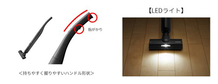 ハンドルは操作性を重視したデザインを採用し、また、吸込口にLEDライトを搭載しました。