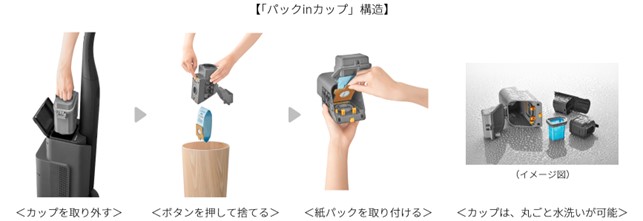 2.自動ごみ収集方式によりお手入れの負担を軽減したほか、紙パックに触れずにごみ捨てが可能な「パックinカップ」構造を採用