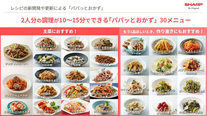 また、レシピの新開発や更新もおこない、2人分の炒め物や煮物などの調理が10~15分でできる「パパッとおかず」として、新たに30メニューを搭載しました。