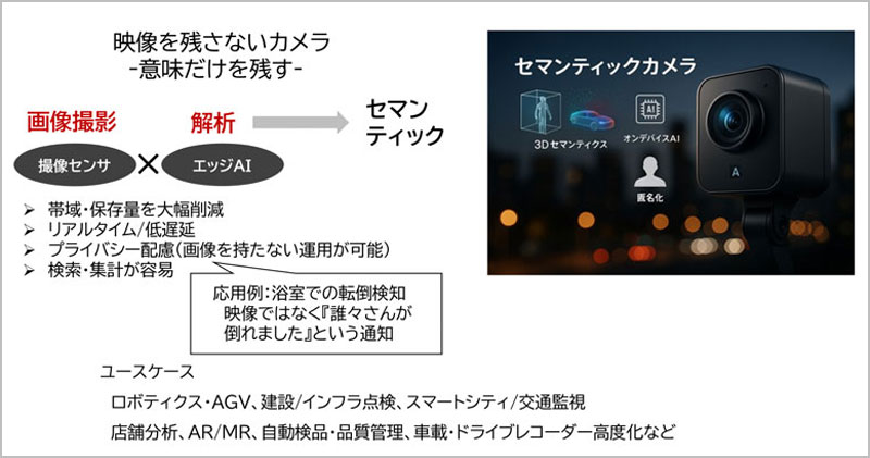 撮影した静止画または動画から要素を抽出し、情報のみを残すものです。画像/映像データを転送・処理しないことから、データ容量が小さくなる利点があるほか、プライバシーも保護されるため、たとえば、浴室内での転倒事故の検知など幅広い用途での活用が期待されています。