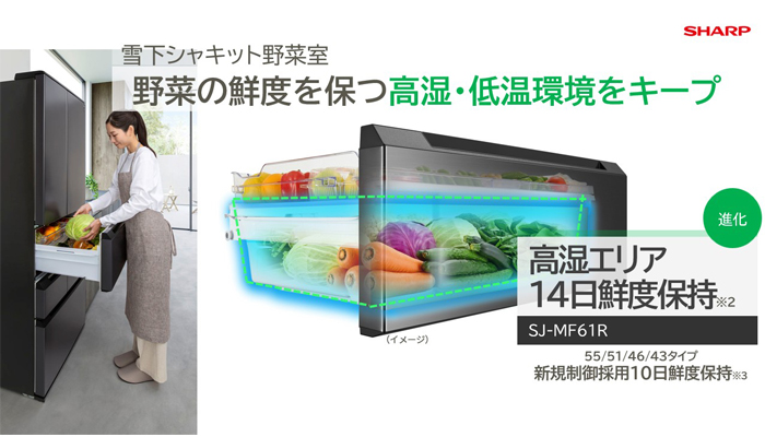 「雪下シャキット野菜室」は、野菜を低温・高湿環境となる雪の下で保存し、甘味を引き出しながら鮮度を維持する雪下保存の仕組みを応用しました。野菜室の温度を約2~5℃の低温に制御することで、野菜の甘味を引き出します※3。上段ケースで下段ケースを密閉する高湿シールド構造を強化し、密閉性をさらに高めることで14日間の鮮度保持が可能になりました。<SJ-MF61R>は、上段ケースで下段ケースを密閉する高湿シールド構造を強化し、密閉性をさらに高めることで14日間の鮮度保持が可能になりました。<SJ-MF55/51/46/43R><SJ-MW46R>では、10日間の鮮度保持が可能です※4