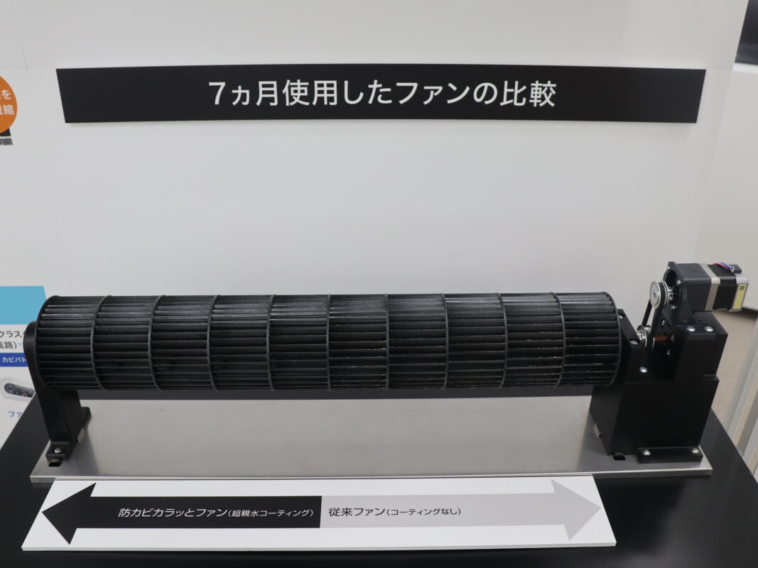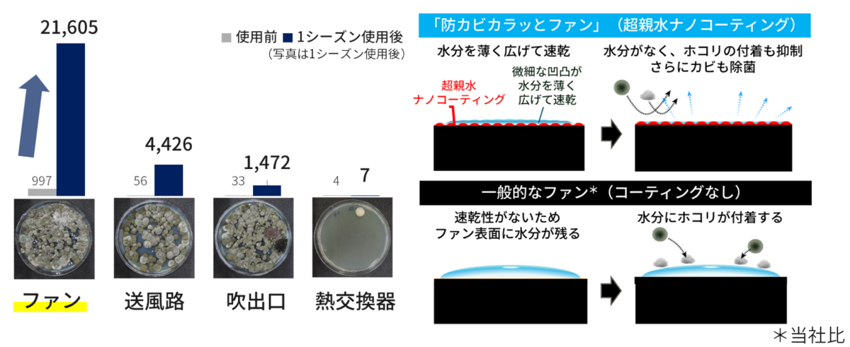 「防カビカラッとファン」の紹介に先立ち、ゲスト登壇いただいた真菌類研究の権威である、県立広島大学の森永名誉教授より、カビの根本原因は「水分」と「ホコリ」であることをご説明いただきました。また、エアコン内部で特に多くカビが発生するのはファンであることを検証し、ファンに対して対策をおこなうことは非常に有効であるという考えを述べていただきました。