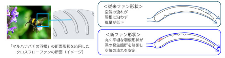 <AY-U71RL2~U28RL>の室内機のファンに、新たに「マルハナバチの羽根」の断面形状を応用した「ネイチャーテクノロジー」を採用しました。マルハナバチの羽根の断面は、先端が丸く平坦な形状をしています。羽根の周りの凹凸部分に渦を発生させることで、摩擦抵抗をなくし、空気の流れをなめらかにしています。ファンに、この羽根の形状を応用することで、渦の発生箇所を制御し、安定した空気の流れを実現。送風効率を、当社従来ファン搭載時と比べ、約4%向上※11させ、省エネ性を高めました。
