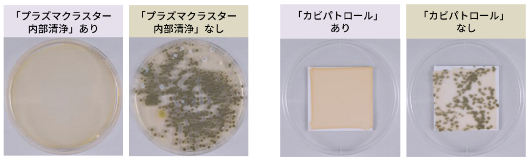 - ※6 ●試験依頼先:(一財)日本食品分析センター ●試験成績書:第25078033001-0101号(2025年8月26日発行)●試験方法:当社試験室(8畳相当)の密閉試験空間にて、室温27℃、湿度70%の条件で、冷房運転を断続的に実施。<AY-U22RS>にて運転後に「プラズマクラスター内部清浄」をおこなった場合と、おこなわない場合で、カビを滴下した試験片のサンプルを試験依頼しカビの数を比較。■試験結果:3日後にカビが99.0%以上除去されていたことを確認。実使用空間での実証結果ではありません。
