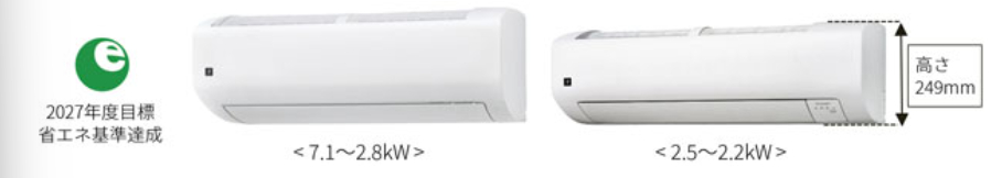 - ※10 国内家庭用エアコン 2027年度目標省エネ基準達成モデルにおいて。2.5kW、2.2kWクラス 室内機高さ249mm。2026年1月27日現在(当社調べ)。