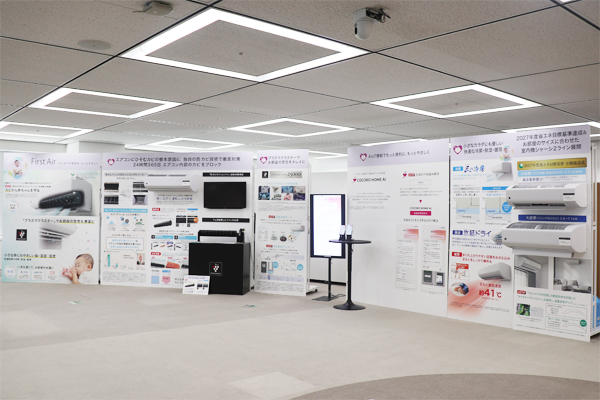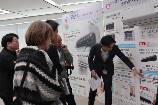 続いて、同 国内商品企画部 主任の福地さんより、新製品の特長を紹介しました。ファンの水分とホコリを排除することでカビ発生に対策※1した「防カビカラッとファン」や、エアコンで初めて※2対応した生成AIサービス「COCORO HOME AI」、2027年度の省エネ基準を全機種で達成していることなどについて説明しました。ユーザーが気づいていない“半歩先”の目線で、エアコン内部のカビに着目し、お子さまをはじめとする幅広い方々に使用いただけるよう、開発したことをアピールしました。