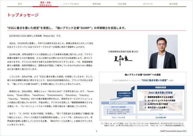 ESGに重点を置いた経営の実践を通じて、「強いブランド企業“SHARP”」の確立を目指す当社の方針を説明しています。