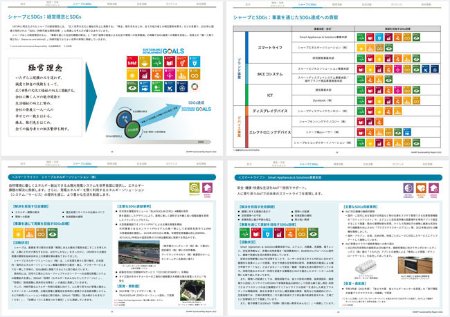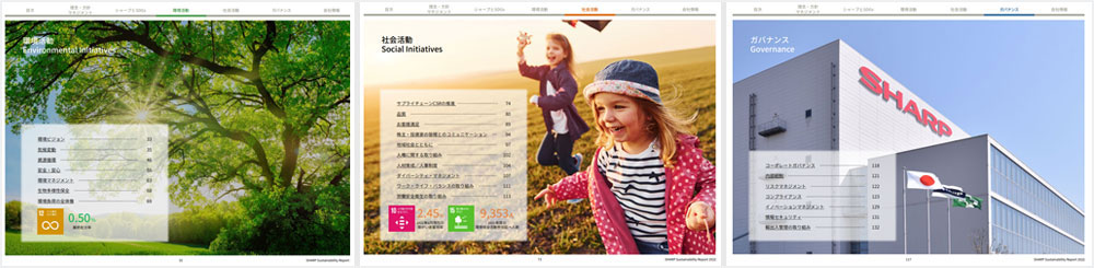 〈理念・方針・マネジメント〉、〈シャープとSDGs〉、〈環境活動〉、〈社会活動〉、〈ガバナンス〉に分けて情報開示しています。