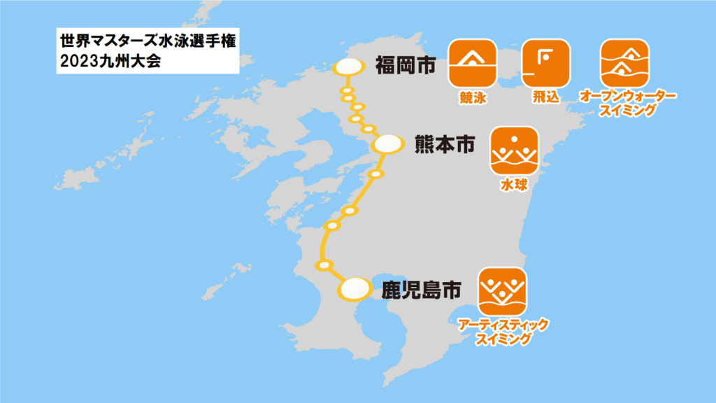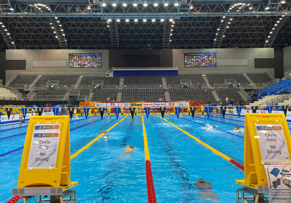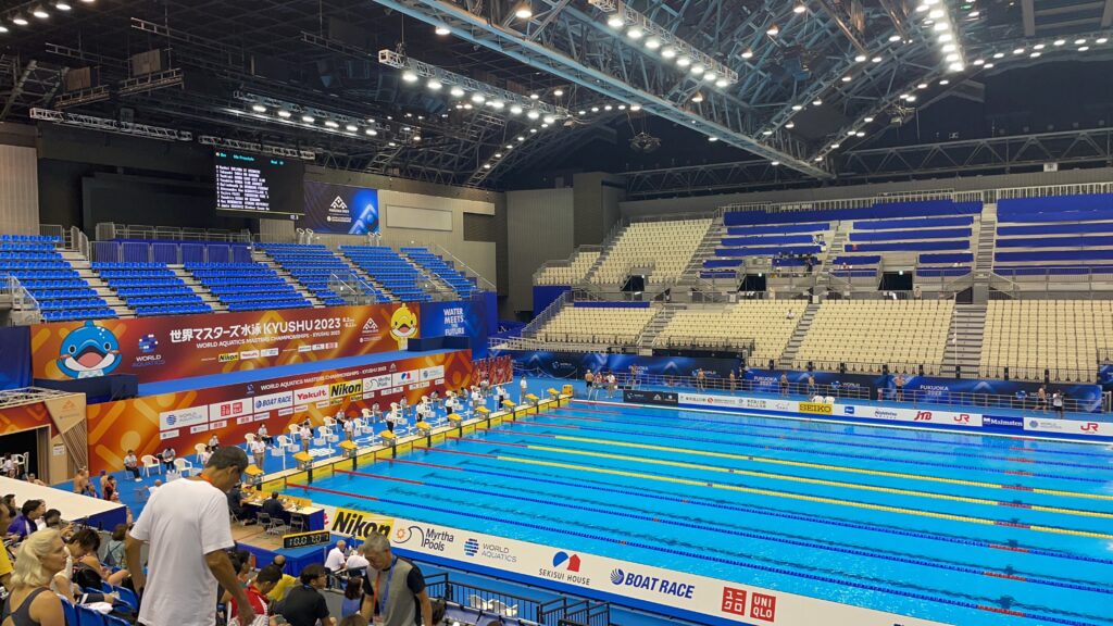 世界マスターズ水泳選手権は、前回は韓国の広州広域市、前々回はハンガリーのブダペストで開催されたのですが、今年は日本の九州で開催でした!福岡市・熊本市・鹿児島市の3都市で各競技が競われ、競泳はマリンメッセ福岡で開催されました。