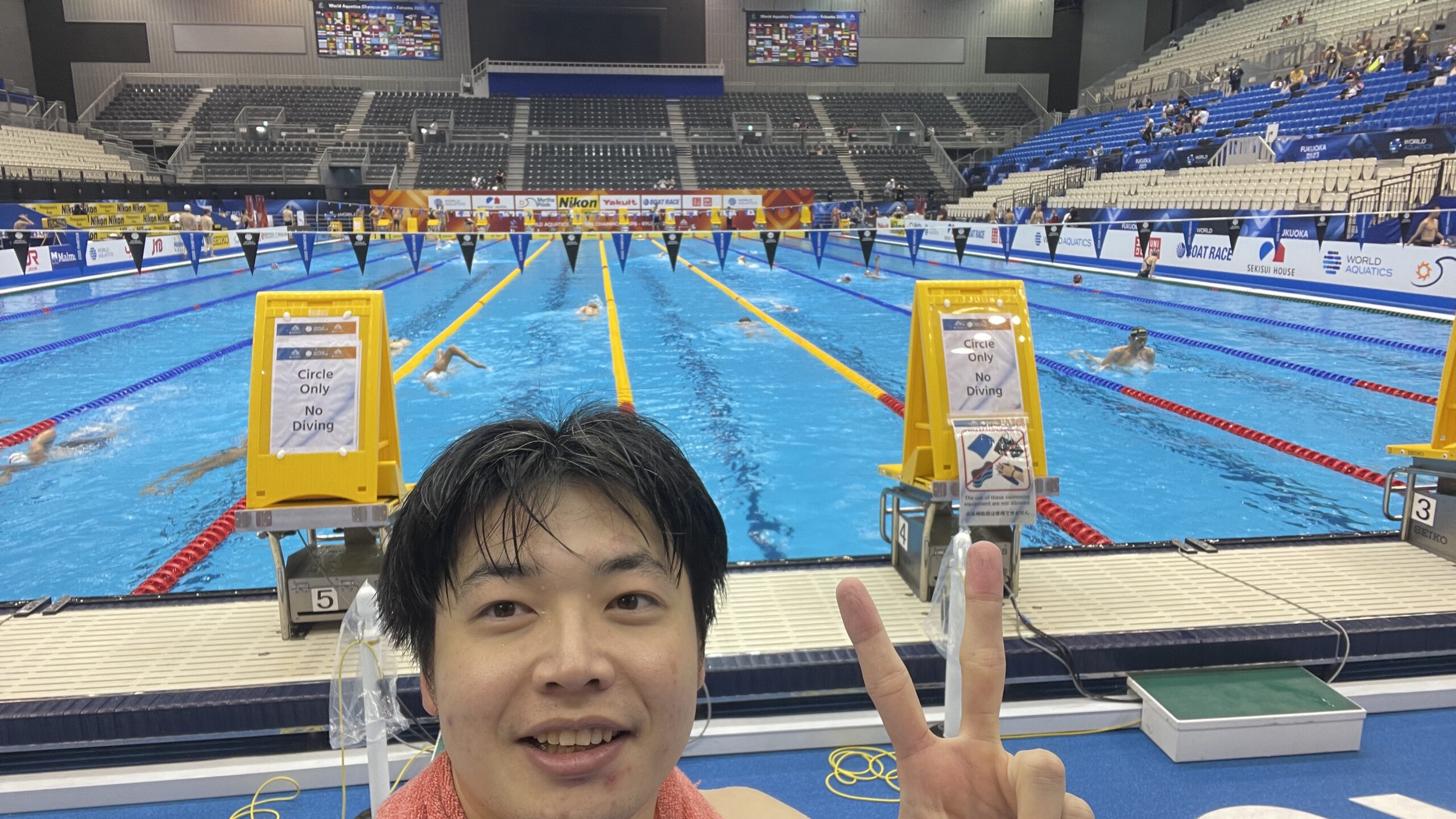 初めての世界マスターズ水泳選手権でした!意外と緊張はしなかったのですが、結果が思ったよりも振るわなかったのが悔しかったです。ですが、自分の今できる最大限の力は発揮できたと思います!