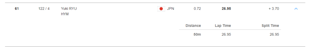 結果は、50m自由形が26.95秒で61位、50m平泳ぎが32.74秒で23位という結果でした!