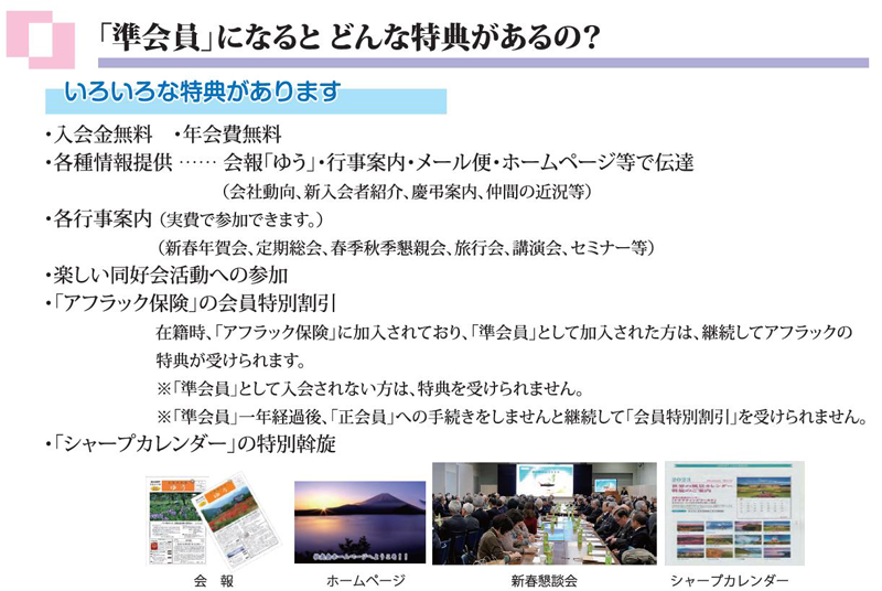 さらに、正会員になると、シャープ製品「修理特別割引」や入会記念品の贈呈、人生の節目にあたる慶祝などの特典があります。