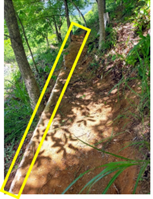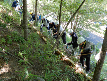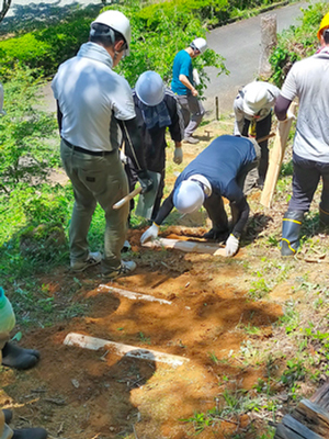 事前に森林組合さまに、伐採から、皮はぎ、カットまでしていただいた檜(ヒノキ)を使い、参加者が鶴嘴(ツルハシ)※1や鍬(クワ)※2、鋤簾(ジョレン)※3などの道具を手に、階段の補修や新しい散策道の土留めの設置を行いました。
