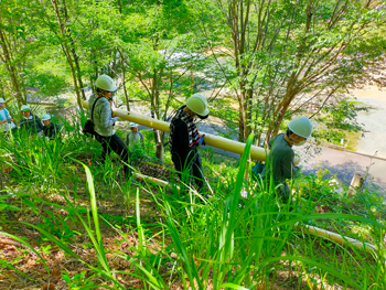 5月18日(土)に従業員17名が、宮川森林組合さまの指導のもと、三重県松阪農林事務所、多気町役場の方とともに新しい散策道づくりや既存の散策道整備、下草刈りを行いました。