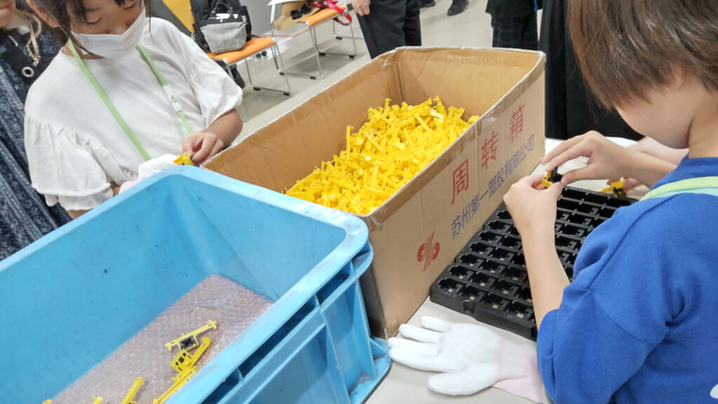 午後からは、今回初の試みである『工場体験』をテーマに、「クラム※2組立て競争」、「DPS※3を利用した反射神経を競うゲーム」を実施。前者では、4チームに分かれてそれぞれのチームで500個のクラム組立て競争を行いました。チーム戦で競争したことによって、盛大な熱気に包まれました。