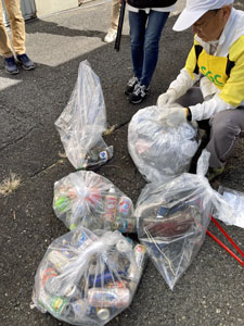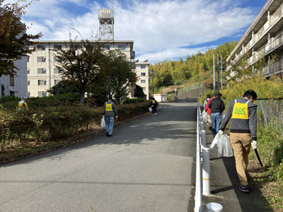 事業所周辺の清掃では、9名が約2.5kmの道のりを1時間かけて清掃し、空き缶などのゴミを回収しました。