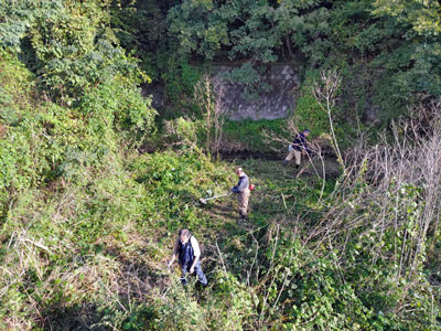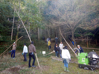 天理古墳シャープの森では、ササユリの自生・育成エリアの保全、および周辺竹やぶの枯れ竹の伐採や整理を20人で行いました。