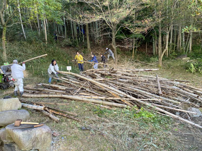集められた竹は200~300本にもなりました。その場で竹粉砕機を使って竹チップに加工、古墳石室周辺に散布し、雑草防止に再利用しました。