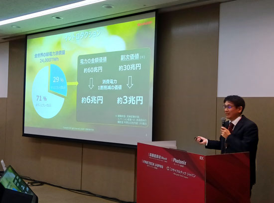 11月12日(水)から14日(金)まで、幕張メッセ(千葉県千葉市)で日本最大級の電子ディスプレイ産業展「第35回ファインテックジャパン」が開催され、展示会初日(12日)に、シャープディスプレイテクノロジー株式会社※1 パネルセミコン研究所 次世代技術開発統轄部 統轄部長の箕浦さんが、「脱炭素社会を切り拓くシャープのディスプレイ開発」と題する講演を行いました。