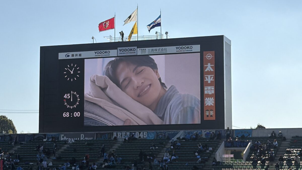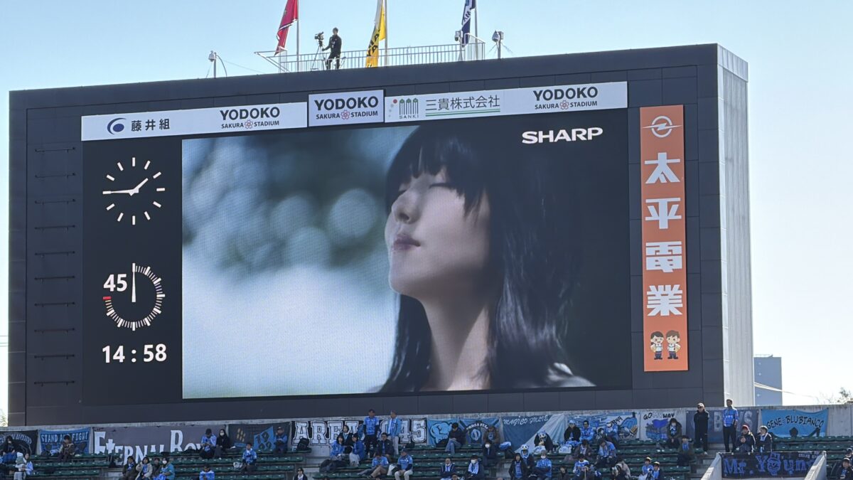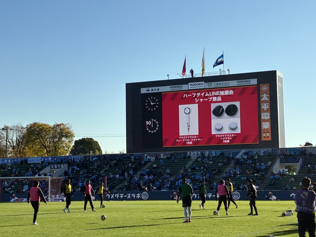 ただ、オープニングタイムには、池田愛恵里さんによる、ヘアブラシ&ドライヤーの紹介や、試合前&ハーフタイムも会場では志尊淳さん・浜辺美波さんご出演のCMが大型ビジョンで流れ、さらには抽選会が行われたり、試合中には、LEDリボンをSHARPロゴがジャックしたりと、サポーティングマッチにふさわしく、SHARP、SHARP、SHARPな演出が続きました。