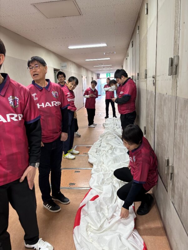 時間になり、声がよく通るセレッソ大阪スタッフの男性に案内されたのはピッチ裏の廊下。そこにはすでに細長く丸められた布が横たわり、静かに持ち上げられるのを待っていました。これが広がるとテレビでよく見かける丸い大きなフラッグになります。ここで声がよく通るスタッフさんから説明を受けます。