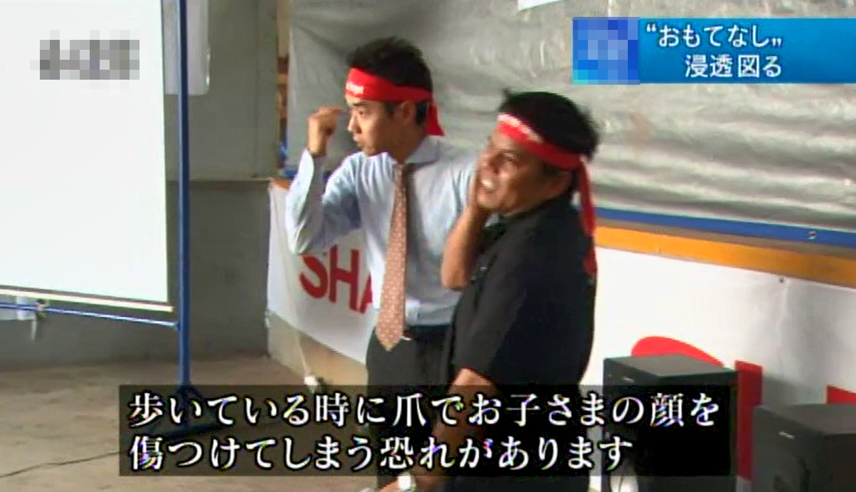また、NHKが「日本式ノウハウで差別化する日本企業」というテーマで、私が担当していたインドネシアを取材する事となり、急遽カメラの前でATOM研修を行いました。緊張しながらでしたが、インドネシアのリーダーと一緒に研修し、「お子様の目を傷つけないように爪を手入れしましょう!」と言っている姿をニュースで放映頂きました。