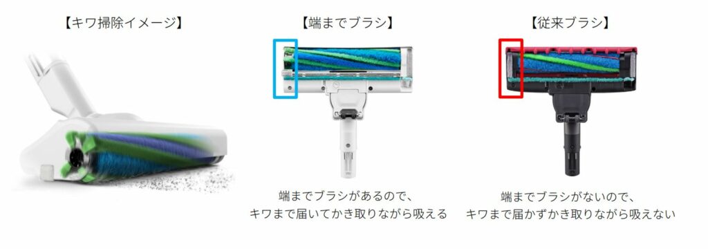 とりあえず、端っこにあるノズル本体が沈みこまないように支える(床面の傷つきを防ぐ)部分を取り払いブラシを端まで伸ばしてみました。お、壁際のゴミ吸えるしいけるやんと思ったのは束の間で、やはりノズルを支える部分がなく沈み込んでしまい、まあそんな簡単にはいかないなと思いました。