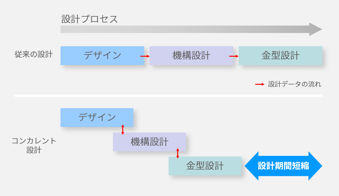 当時起ち上げようとしていた3次元設計体制の要は「コンカレント・エンジニアリング」。従来直列的であった【デザイン→機構設計→金型設計】の設計プロセスを、設計初期からデータのキャッチボールを進めて並列化し、設計期間の短縮と高精度化を図るというものでした。