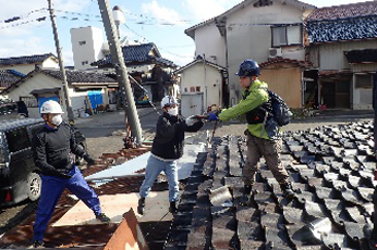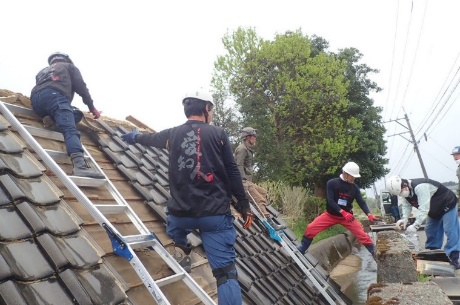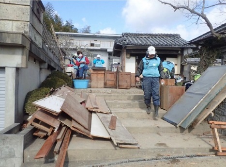 (人海戦術で家財出し・泥出し・瓦などの搬出etc スコップや掃除道具・軽トラを使っての作業)