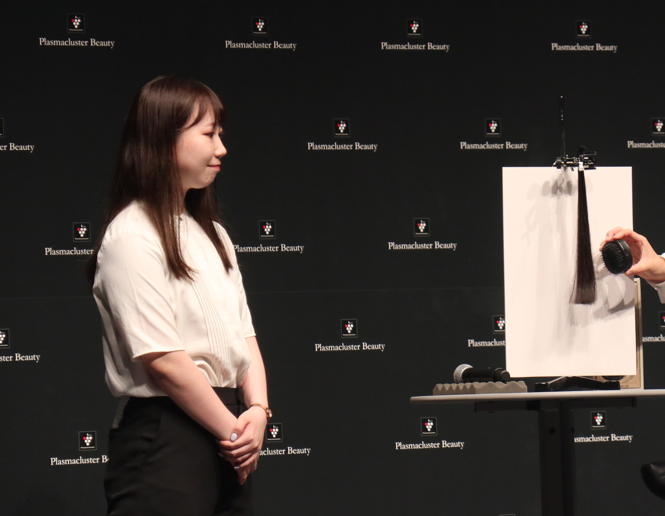 記者発表でのデモンストレーションでは、一緒に登壇させていただき、プラズマクラスター効果を実演(のアシスタント)。